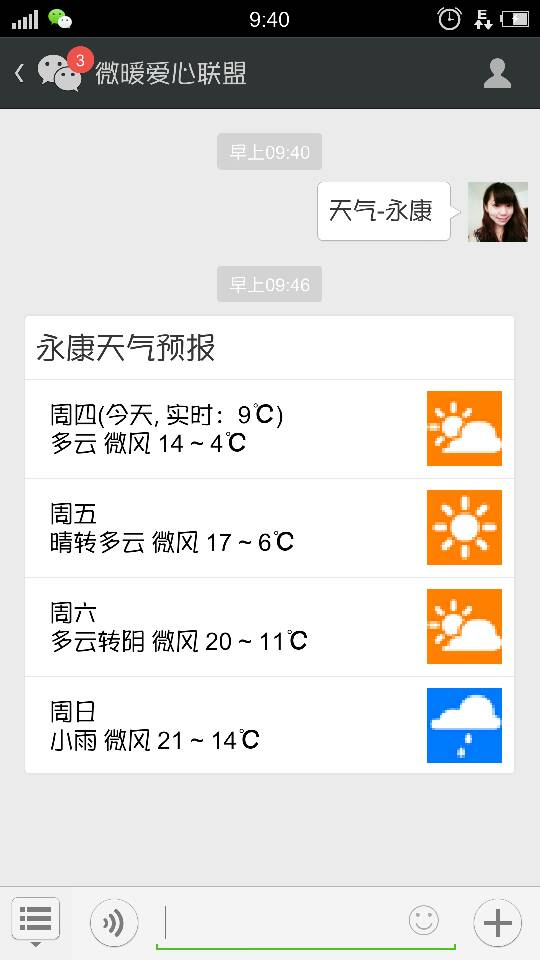 采訪中,陳總和筆者也做了現(xiàn)場試驗。筆者隨機關(guān)注了環(huán)訊旗下某微網(wǎng)站所對應的公眾平臺,在聊天界面中輸入“天氣-永康”,很快,系統(tǒng)便自動回復永康天氣的即時信息。“這些助手客戶可以自行選擇,像天氣之類的,幾乎所有公眾平臺都適用,不過股票金融類的,就適用于某些特定的客戶。”