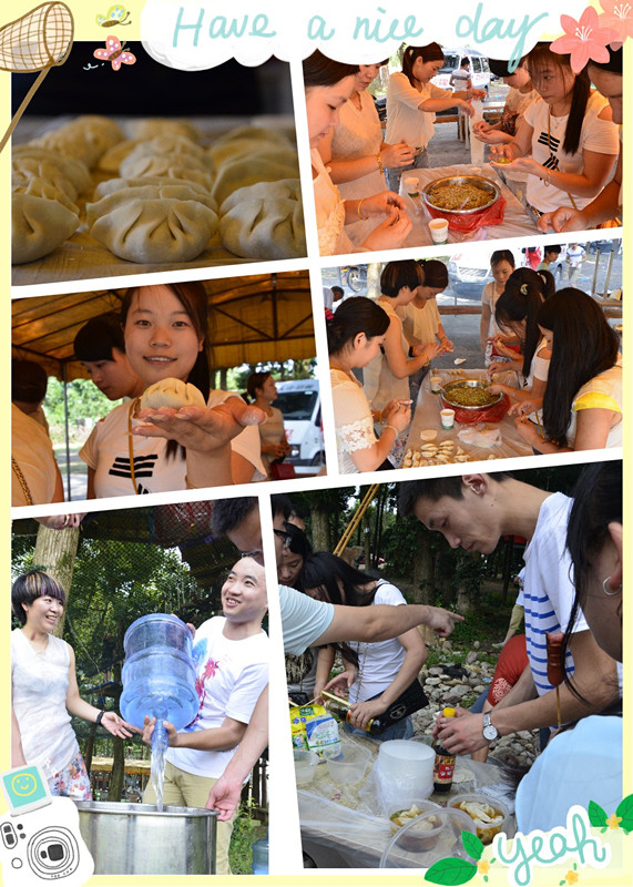 為了讓大家有個開心的午飯,一些同事積極幫忙搬水、搬水果和燒烤食材,心靈手巧的女同事們也現(xiàn)場包起了餃子,來自不同區(qū)域的人包出來的餃子也是各具風(fēng)采,有永康本地的傳統(tǒng)餃子,也有“花邊”餃子,看,連沙縣小吃的蒸餃也有。相對于女同事的“悠哉”,男同事也發(fā)揮了其特長,扛水、撿柴、生火,惹得大家紛紛點贊。