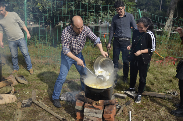 留下的人負(fù)責(zé)準(zhǔn)備午飯,伙伴們分工有序,熱火朝天的干起來,有人修整領(lǐng)地、有人洗刷鍋盆、有人洗菜、有人壘灶臺、有人生火,有人包餃子,干得井井有條。大家激情高漲,展現(xiàn)自己的廚藝。隨著炊煙裊裊升起,一陣陣香味也撲鼻而來,餃子、排骨豆腐、牛肉燉蘿卜、永康小麥餅等佳肴紛紛端上桌來,十分豐富,大家已等的迫不及待了,狼吞虎咽的吃起來了,一派其樂融融的景象。
