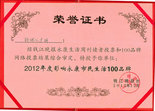 12月30日晚,由錢江晚報(bào)主辦,環(huán)訊傳媒承辦的2012年度影響永康市民生活100品牌頒獎(jiǎng)盛典晚會(huì)于永康市行政會(huì)議中心隆重舉行。環(huán)訊人才網(wǎng)以80679的高票入選此次活動(dòng)。